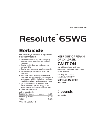 Resolute 65wg label. RESOLUTE 65WG f Have the product container label or Material Safety Data Sheet with you when calling Syngenta 800-888-8372 a poison contol center or doctor or going for treatment. I purchased the generic form of Barricade Resolute 65WG and am not 100 clear on their instructions for application. RESOLUTE 65WG HERBICIDE ChronicSubchronic Toxicity Studies Carcinogenicity Toxicity of Other Components Target Organs Other Toxicity Information None ReproductiveDevelopmental Effects Active Ingredients Inert Ingredients Prodiamine.