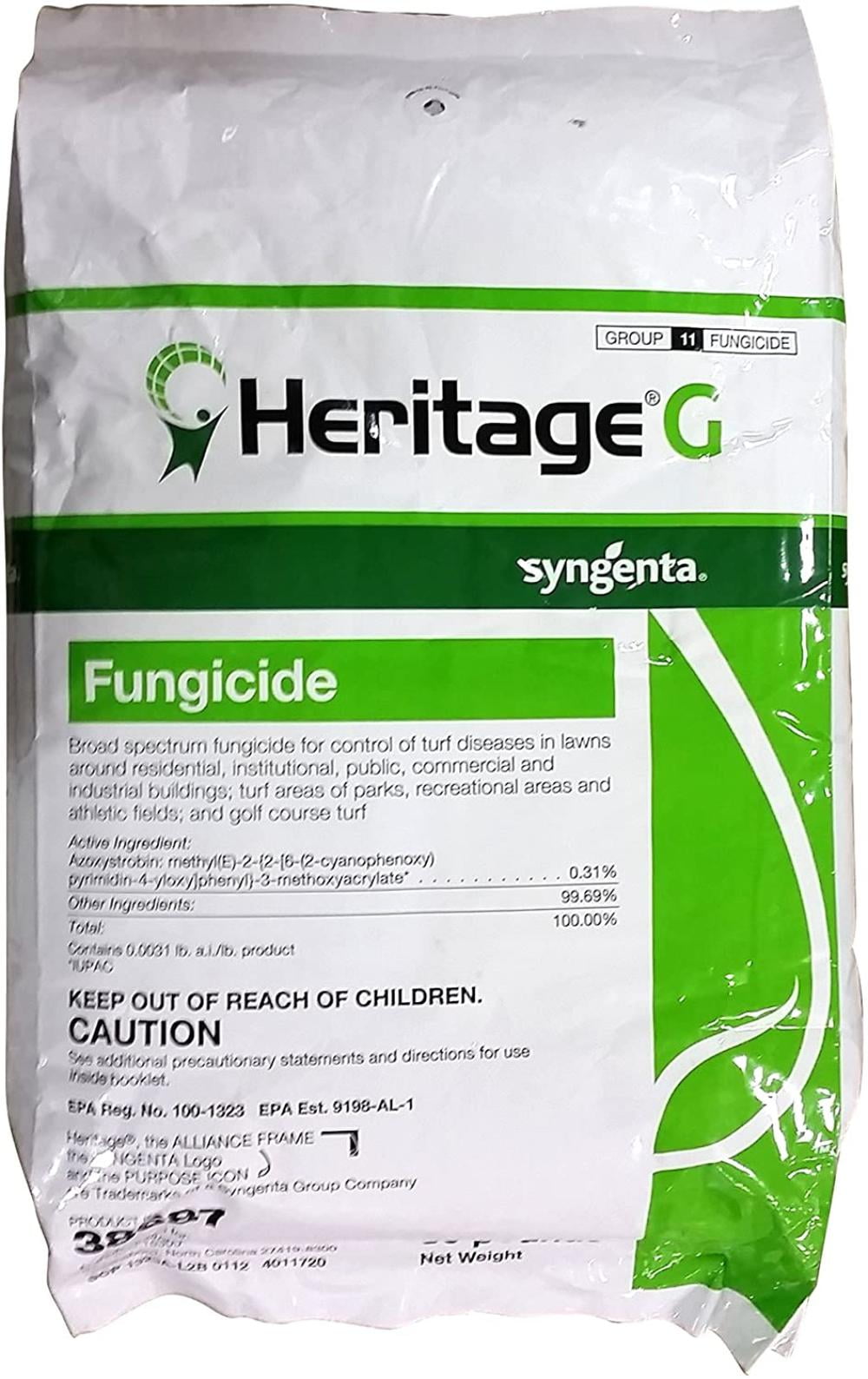 Heritage offers control for up to 28 days on a variety of turfgrass diseases including. Heritage G Fungicide is a preventative and curative fungicide that takes care of a large variety of diseases listed in the above section and in the product label. 2-4 lbs per 1000 sq feet see label for specific use rates When disease symptoms begin start applications of Heritage G.